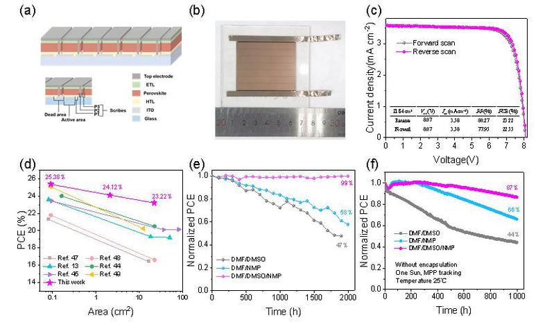 To validate the scalability of the technique, the researchers collaborated with Guangdong Mailuo Energy Technology Co., Ltd. to fabricate a mini-module with an active area of 21.84 cm², which reached an efficiency of 23.22%. This result represents a leading performance among reported perovskite modules of similar size, significantly narrowing the efficiency gap between lab-scale cells and large-area devices.