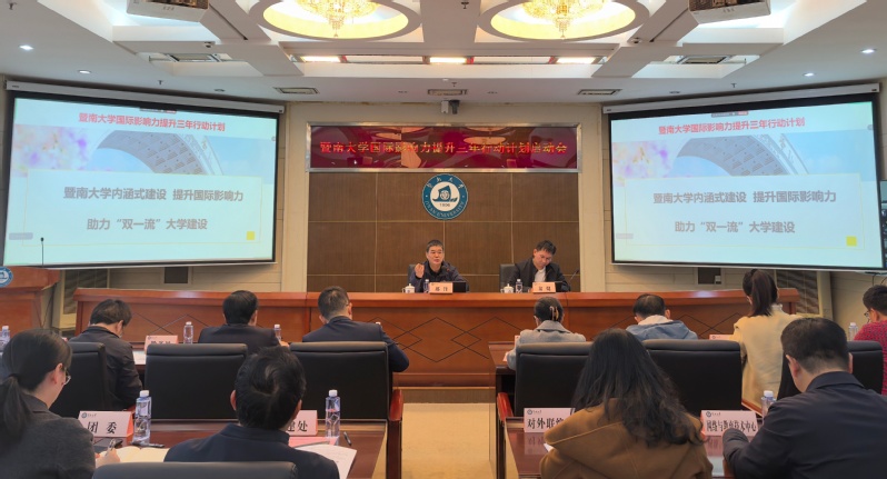 On November 19th, Jinan University held the launch meeting of the "Three Year Action Plan for Enhancing International Influence". The conference aims to implement the deployment of enhancing the international influence of education in the national education development plan, further promote the connotative development of schools, and coordinate the planning of a new chapter of international development. Principal Xing Feng attended the meeting and delivered a speech, while Vice Principal Weng Jian presided over the meeting.